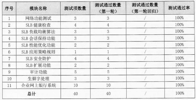 功能性方面:測(cè)試范圍包括網(wǎng)絡(luò)功能測(cè)試、SLB健康檢查、SLB負(fù)載均衡算法、SLB會(huì)話(huà)保持功能、SLB安全防護(hù)、SLB擴(kuò)展測(cè)試等11個(gè)模塊,共計(jì)執(zhí)行40條用例,均通過(guò)測(cè)試。