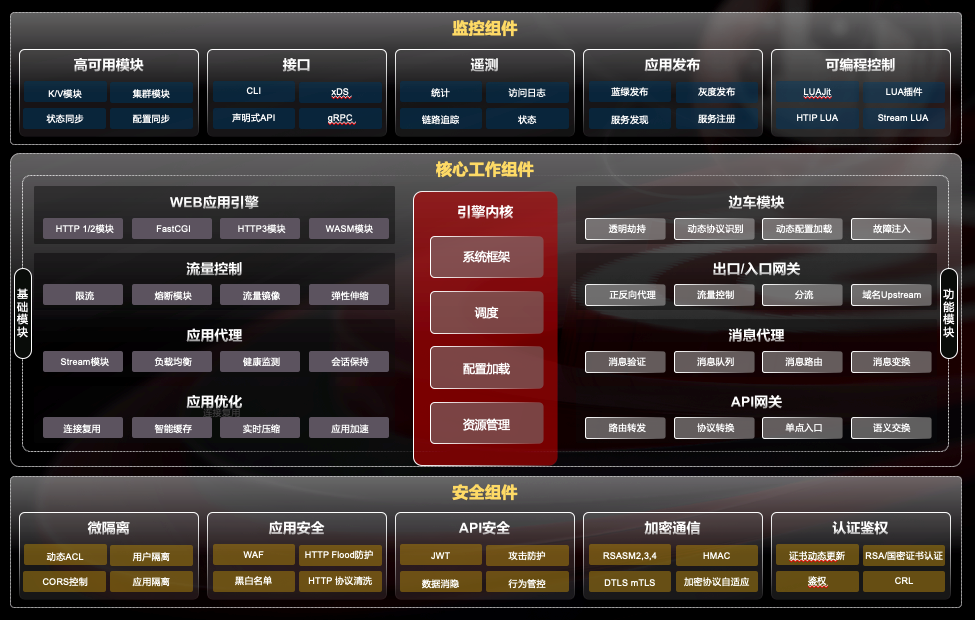 李剛強(qiáng)調(diào),“OpenNJet 充分吸收了開源生態(tài)的優(yōu)秀擴(kuò)展模塊 ,在功能規(guī)劃上包含了5大類18類組件,特別是隨著安全威脅的快速增加,規(guī)劃了安全組件。除安全功能外,‘企業(yè)特性’也是OpenNJet關(guān)注的重點領(lǐng)域,如內(nèi)置的高可用性,自動化的集群發(fā)現(xiàn)及配置同步等?!?/p>