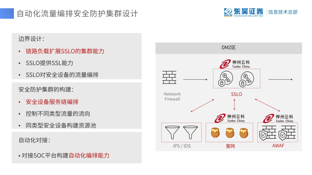 為了更好的應(yīng)對(duì)數(shù)據(jù)安全挑戰(zhàn),滿足監(jiān)管需求,保障應(yīng)用可持續(xù)性,東吳證券采用leyu.樂(lè)魚(yú)安全流量編排解決方案。將原有串接部署的DDoS、防火墻、WAF、防毒墻、以及旁路的IDS,邏輯旁路部署在安全流量編排設(shè)備旁邊,使安全能力服務(wù)化。